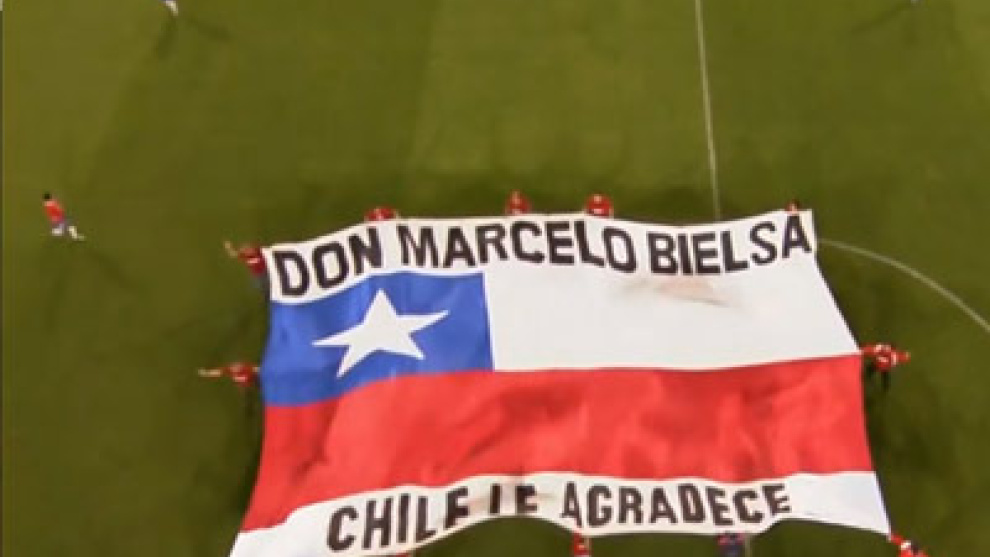 Sucedió tras el sorteo de campos, con los equipos ya colocados y el árbitro dispuesto a pitar el comienzo del choque. Diez aficionados accedieron desde un fondo hasta el césped portando una bandera chilena gigante con la leyenda: "Don Marcelo Bielsa, Chile le agradece". La grada rugió, entre sentida y furiosa, y Bielsa, azorado y cabeza abajo, paseó meditabundo por el área técnica hasta que, agradecido, levantó tímidamente la mano y saludó a uno y otro lado.