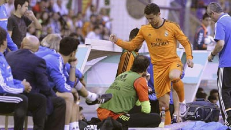 El delantero portugués del Real Madrid Cristiano Ronaldo se retiró lesionado hoy a los ocho minutos del partido pendiente de la trigésima cuarta jornada de la Liga BBVA contra el Real Valladolid.