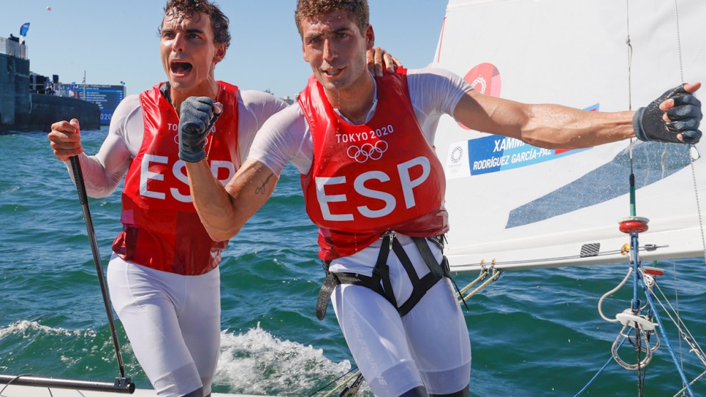 En Enoshina, sede de la vela, los regatistas españoles defendieron bien la tercera plaza, con Nueva Zelanda peleando desde el cuarto puesto, pero sin poder deshacerse del control de los españoles. Finalmente, consiguieron el tercer puesto en la Medal Race final y lograron emular el bronce de Joan Cardona en la clase Finn.