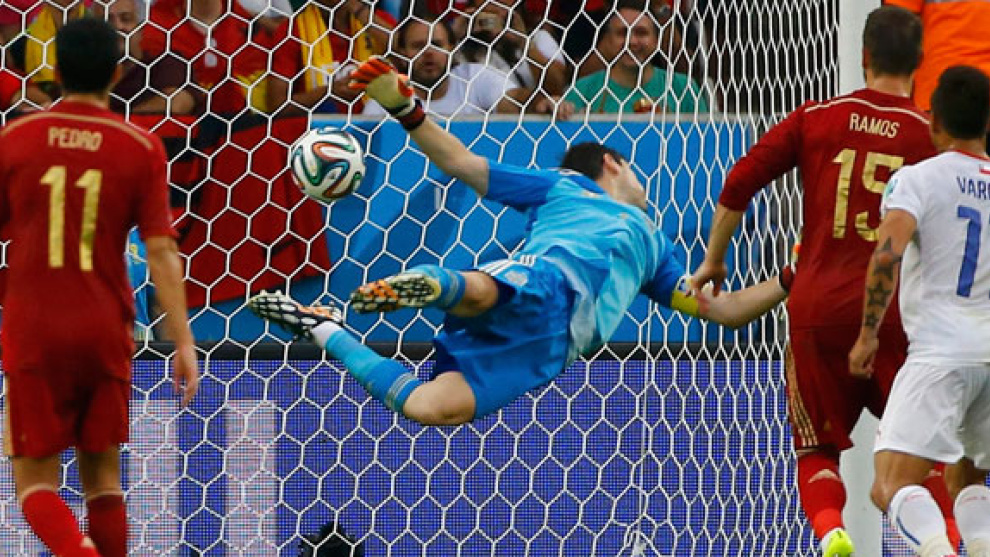 España, mientras, comenzaba a exhibir las mismas debilidades que ante Holanda. Desde Casillas, que ha estado desconcentrado en todo momento, hasta la soledad de Diego Costa en punta. La selección campeona de todo, que había basado sus triunfos en la solidez defensiva, se mostró compasiva con su rival. Ramos y Martínez no conectaron y fueron desbordados. Azpilicueta y Jordi Alba, timoratos y encerrados, no ofrecieron ninguna opción por las bandas. Xabi Alonso y Busquets no encontraron espacios para pensar y mover la pelota. Iniesta solo proponía batallas solo contra el mundo. Pedro y Silva chocaban contra una muralla y a Diego Costa siempre le sobraba un control.
