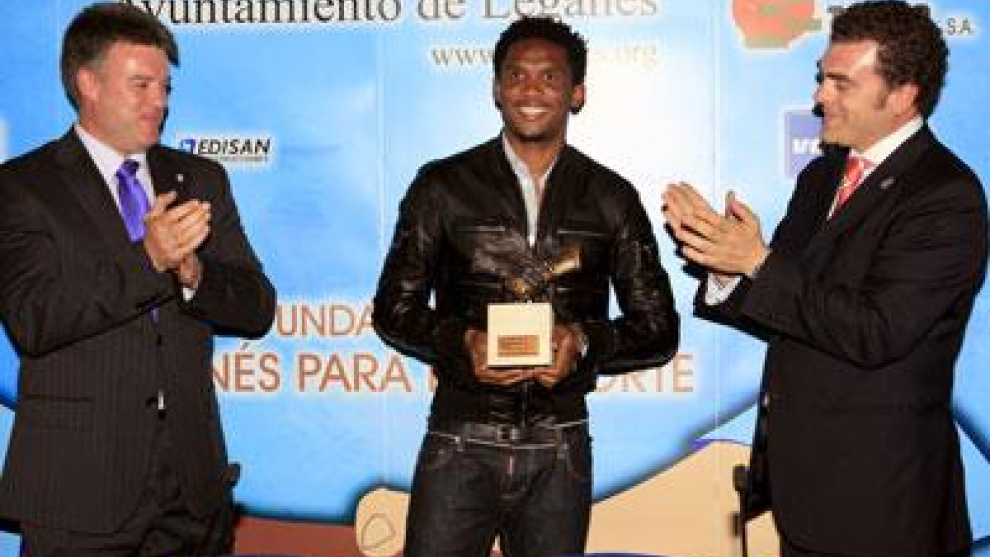 También recordó sus días en el Leganés, "cuando cogía el tren desde Atocha, tranquilamente", y nadie le pedía autógrafos o le preguntaba quién iba a ganar la Liga. El camerunés, distendido, subrayó constantemente la proximidad y el cariño que siente por Leganés e incluso bromeó al augurar que será este equipo el que gane la Liga. Durante el acto, el alcalde de la ciudad, Rafael Montoya, hizo entrega al futbolista de una escultura con el símbolo de la Fundación, unas manos que se estrechan.