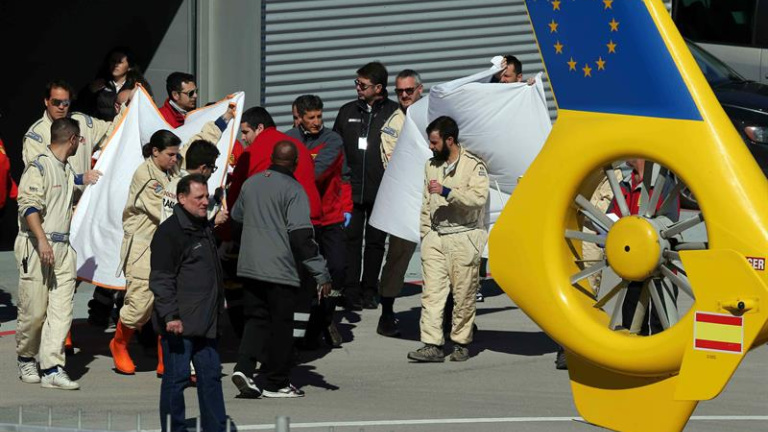 A pesar de estar consciente, el piloto español ha sido evacuado en ambulancia y luego trasladado en helicóptero al hospital para evaluar su estado físico, como exige el protocolo.
