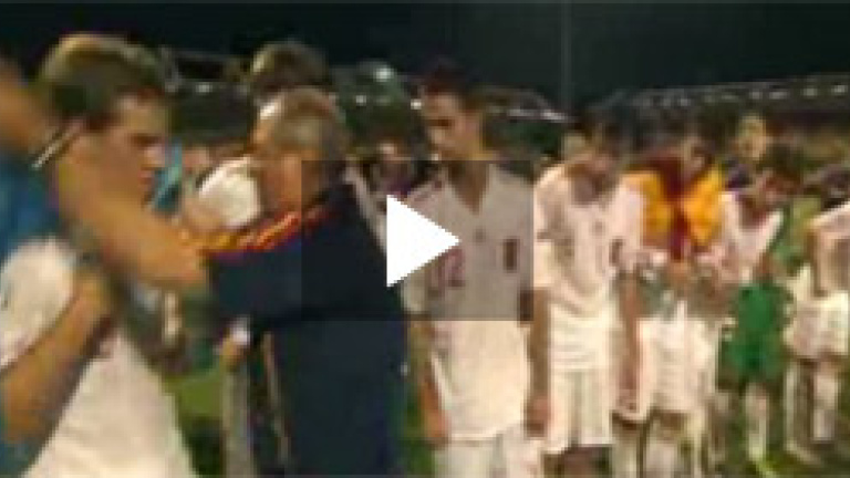 La selección española sub 19 ha llegado a la sede de la Federación con la copa que les acredita como actuales campeones de Europa. Durante el acto el seleccionador Ginés Meléndez ha querido restar importancia al hecho de que ayer le quitara sin mediar palabra y por sorpresa la bandera de Asturias a su jugador Muñiz durante la celebración. Meléndez se ha escudado en "las normas de la casa". En concreto, a la nueva norma que impide portar una bandera que no sea la española antes de subir a por las medallas. El seleccionador asegura que fue un error suyo al no recordarles a los jugadores que no podían portar ninguna que no fuera la de España.