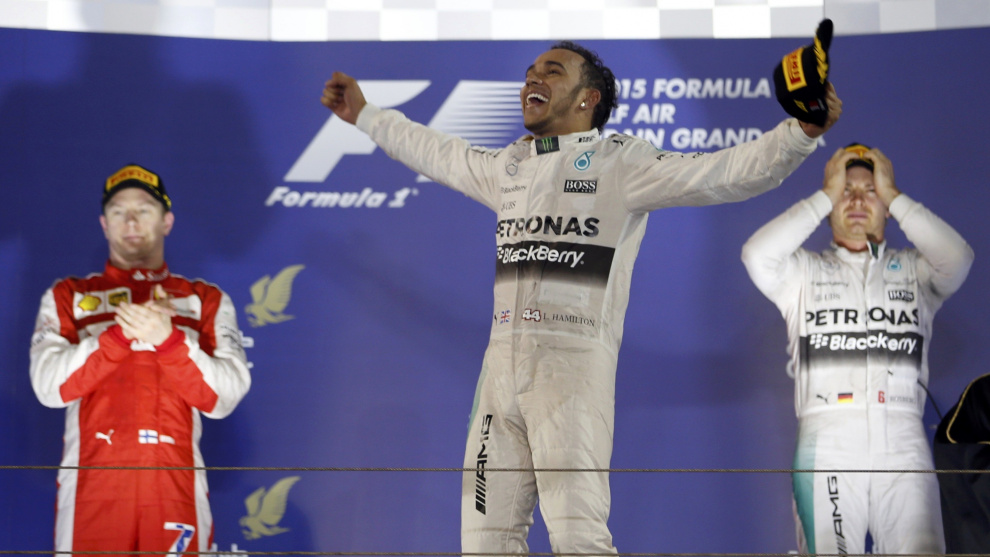 MADRID.- El piloto británico Lewis Hamilton (Mercedes) ha logrado este domingo la victoria en el Gran Premio de Baréin, cuarta prueba del Mundial de Fórmula 1 disputada en el circuito de Sakhir, seguido por el finlandés Kimi Raikkonen y escoltado en el podio por su compañero Nico Rosberg (Ferrari).