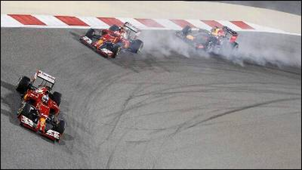 Accidente de Maldonado y GutiérrezLa carrera mantuvo el guión hasta las últimas diez vueltas, cuando un aparatoso accidente entre Pastor Maldonado (Lotus) y Esteban Gutiérrez (Sauber), que hizo que el mexicano diera una vuelta de campana con el monoplaza, obligó al safety car a salir a pista. Con el coche de seguridad en la pista las posiciones cambiaron radicalmnte. Fuera de la lucha por las primeras posiciones, Sergio Pérez y Nico Hulkenberg (Force India) se colocaron en la tercera y la cuarta plaza, seguidos por Sebastian Vettel y Daniel Ricciardo (Red Bull), quinto y sexto respectivamente, mientras que Alonso y Raikkonen luchaban por entrar en los puntos.