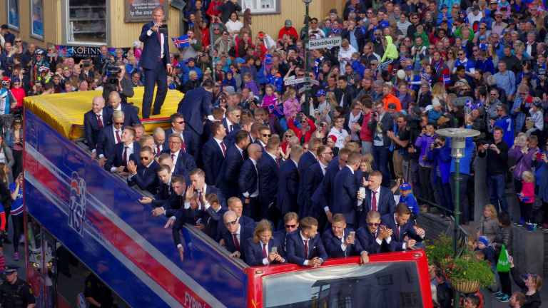La selección islandesa transitó en un autobús de dos plantas con el techo descubierto el centro de la capital, repleto de gente que aplaudía y vitoreaba al equipo que tuvo una actuación sobresaliente en su primera participación en una fase final.