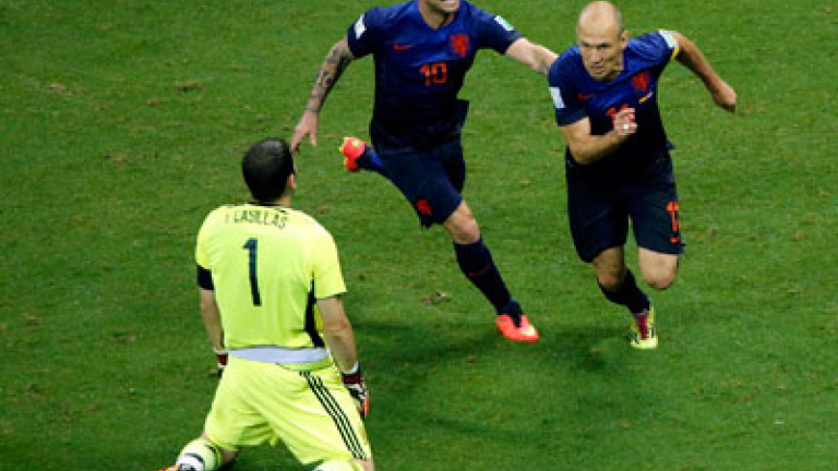 Holanda llevaba mascando cuatro años la derrota en el Soccer City, Robben visualizando aquel mano a mano de Casillas y Van Gaal urdiendo un equipo que pudiese tomarse cumplida venganza de aquel 11 de julio de 2010. El sorteo les puso en bandeja hincar el cuchillo pronto, en el partido de debut en Brasil. Y lo clavó hasta el corvejón de España. La estrella le pesó tanto en Salvador de Bahía que las piernas se contagiaron del plomo. Holanda, sin embargo, voló. Lanzada por dos jugadores que, pese a sus 30 años, viven en estado de gracia: Arjen Robben y Robin Van Persie.