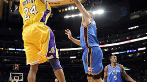Los Lakers demostraron que no terminan de llegar al nivel que se le exige al campeón de la NBA y los Thunder, el equipo más joven de la NBA, les dio una lección de juego de conjunto y una vez más, los campeones se pudieron quedar con el triunfo por 95-92, gracias a las genialidades del escolta Kobe Bryant, anotó 39 puntos, incluidos 13 desde la línea de personal.