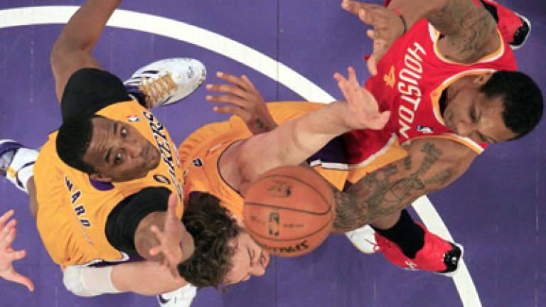 A pesar del mayor protagonismo de Gasol, Steve Blake y World Peace (36-38), Harden mantuvo la muñeca bien engrasada desde la personal y, sacando faltas a sus defensores, se bastaba para dar a Houston una pequeña renta al descanso (44-50) en la que tuvo que ver la falta de recursos de Howard (2/9 en tiros) ante la magnífica defensa de los Rockets.