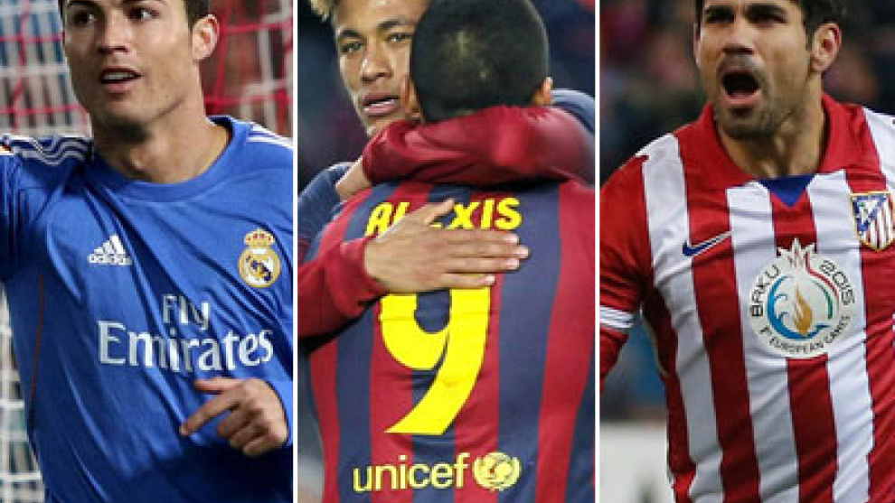 Los 16 tantos anotados Barcelona, Real Madrid y Atlético dan empuje al campeonato más goleador de Europa. Cristiano (17) y Costa (14) lideran un grupo de artilleros que ninguna otra liga puede alcanzar