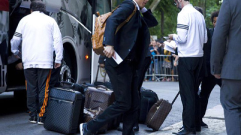Los futbolistas desfilaron los pocos metros que distan desde la puerta del autobús hasta la entrada del hotel rápidamente y sin hacer declaraciones.