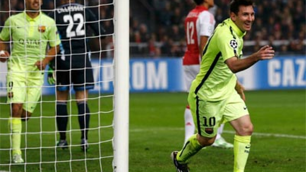 Un doblete de Lionel Messi dio aire al Barcelona en el Amsterdam Arena, donde ganó al Ajax (0-2) y se clasificó para los octavos de final de la Liga de Campeones, en un partido en el que el conjunto azulgrana recuperó parte de su esencia, especialmente en la segunda mitad.