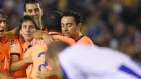 Ayer no encontraron su fútbol Xavi e Iniesta, pero Messi arrancó con ganas de justificar el Balón de Oro. Suficiente. Un cambio de dirección suyo con la pelota cosida al pie en la frontal del área desparramó a toda la defensa del Deportivo. La obra se la desbarató Aranzubía, que con un par de pasos hacia adelante se anticipó a la trayectoria del balón. Cuando ya no pudo hacer nada fue en el gol. Messi se deshizo de Colotto en la media luna poniéndole el cuerpo y ya perfilado, le mandó un zurdazo abajo y ajustado a Aranzubía.