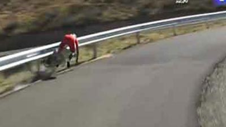 Quintana se ha caído al comienzo del descenso del alto del Moncayo al tomar una curva a derechas en la que ha saltado por encima de su bicicleta al salirse del asfalto. El corredor, que iba ajustándose la zapatilla, no la trazó bien y acabó impactando contra el suelo tras tocar el quitamiedos. Tras unos minutos dolorido y en los que fue atendido por los asistentes del Movistar, cogió otra bicicleta y continuó la carrera.