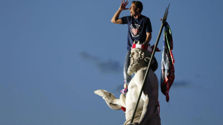 Unos cuarenta minutos tardaron todos en llegar a la fuente de Neptuno, donde aguardaba la multitud de hinchas. Allí, bajo los acordes del himno rojiblanco y en una ceremonia dirigida por el disc jockey Carlos Jean, jugadores y entrenadores fueron de uno en uno al estrado instalado delante de la fuente, con la ausencia de Koke Resurrección, que no estuvo en el acto final por problemas personales, aunque sí hizo el recorrido en el autobús.