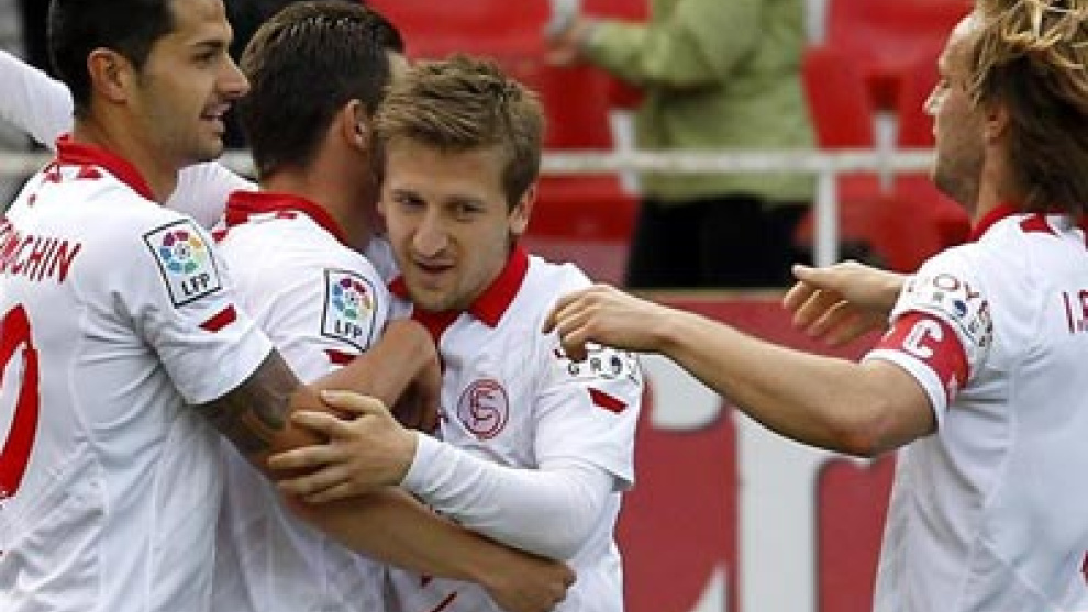 Posibles alineacionesSevilla: Beto; Diogo Figueiras, Pareja, Fazio, Fernando Navarro; M'Bia, Carriço; Marko Marin, Rakitic, Vitolo; y Bacca.
