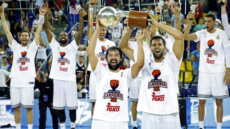 Llull y Felipe Reyes levantan el trofeo de campeón de Liga. EFE/Andreu Dalmau