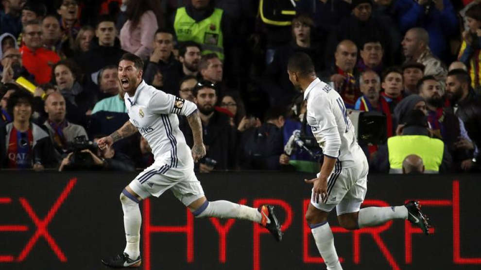 BARCELONA.- El Real Madrid logró mantener la renta de seis puntos que tiene en la Liga Santander respecto al Barcelona gracias un gol en el último minuto de Sergio Ramos, que silenció el Camp Nou y dejó en tablas (1-1) un 'Clásico' que se resolvió en dos jugadas a balón parado.