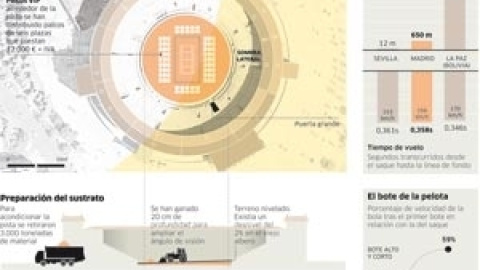 Se calcula que un saque a 216 kilómetros por hora tardaría 0,361 segundos en recorrer una pista de tenis en el nivel del mar, mientras que a 1.000 metros de altura, el tiempo que tardaría en pasar de un lado a otro del terreno de juego sería de 0,356 segundos. La diferencia entre las velocidades de la bola en Madrid y Sevilla es de entre cuatro y seis kilómetros por hora –más rápido en la capital–, pero depende también de otras cuestiones como el desgaste de la pelota o las condiciones del tiempo.