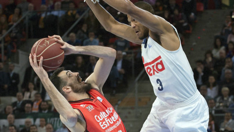 En un abrir y cerrar de ojos, el Real Madrid se vio diez arriba tras un triple de Llull (40-30, min 16), lo que obligó a los taronjas a un esfuerzo extra para frenar las acometidas blancas gracias a su mayor tensión defensiva.