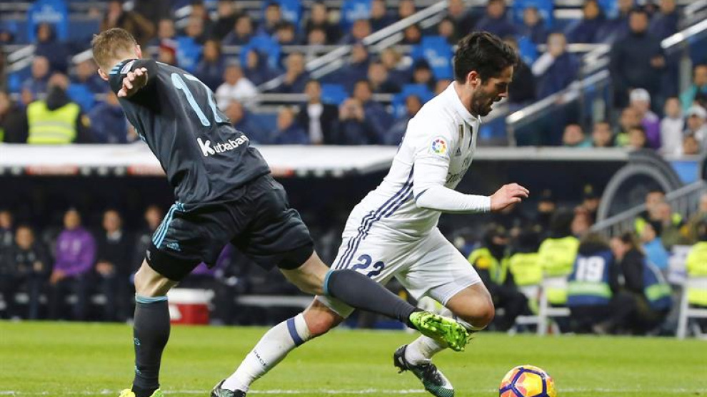 Echando de menos a figuras claves en su juego, como Luka Modric en la construcción o Dani Carvajal y Marcelo en los laterales, solo los impulsos con el balón de Kovacic y la velocidad de Lucas Vázquez ante un superado Kevin aparecían como argumentos de inicio de un Real Madrid que debía salir a morir tras los errores de sus rivales en la jornada, pero que mostraba su impotencia. La Real Sociedad, bien asentada en el campo, aprovechaba la incertidumbre.