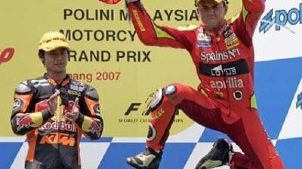 La negra bandera de "Lorenzo´s Land" (tierra de Lorenzo), que se había visto nueve veces en la temporada, dio paso a la bandera española que un emocionado Lorenzo clavó en tierra malaya, en la curva de entrada a la recta de meta. Eso sí, asegurándose antes de que ahí había, registrándolo todo, una cámara de televisión. Pero ahí no acabaría el espectáculo.