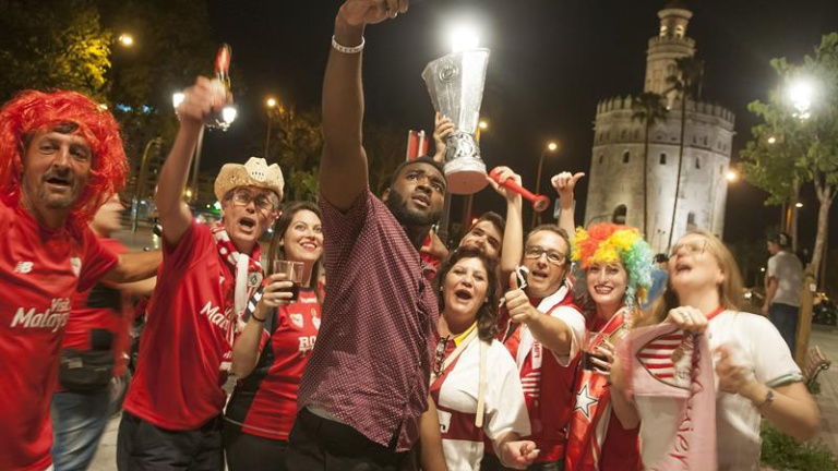 Aficionados del Sevilla celebran la victoria del equipo sevillista en la final de la Liga Europa. /EFE