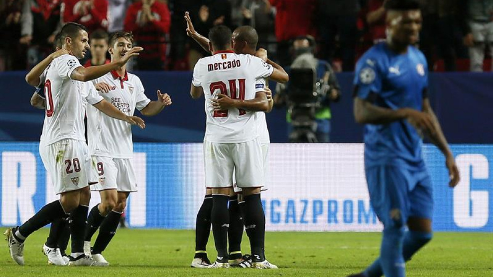 Pese a ello, el conjunto hispalense remató el partido con dos nuevos tantos, en esta ocasión de N'Zonzi y del también francés Wissam Ben Yedder, y solo le quedó esperar a que el Junventus también certificara su victoria ante el Olympique Lyon para asegurar su pase a octavos, pero los franceses empataron en las postrimerías (1-1) y aún tienen opciones de luchar por una de las dos primeras plazas.