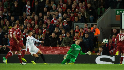 El exsevillista Alberto Moreno, Mané o Salah fueron una pesadilla para los andaluces, un peligro constante. El Liverpool tuvo tres buenas opciones para empatar aún en el primer cuarto de hora, con un tiro del holandés Wijnaldum que desvió el danés Kjaer, otro de Mané que despejaron entre Sergio Rico y Kjaer, y un cabezazo de Firmino.