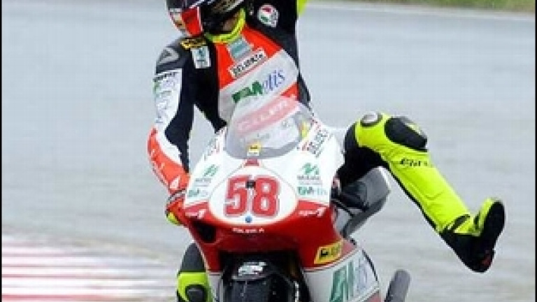 La lluvia lo cambia todoCon la lluvia arreciando sobre la pista, las cosas comenzaron a cambiar, salvo Simoncelli, que mantuvo bien el ritmo, el trío perseguidor ralentizó el ritmo y ello propició que Pasini y Bautista empezasen a acercarse a ellos. Todo podía suceder cuando aún quedaban nueve vueltas de carrera.