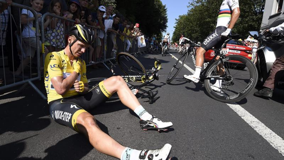 El líder del Tour abandona la carrera. Nibali y Quintana también se fueron al suelo pero no perdieron tiempo. Etapa para el checo Zdenek Stybar