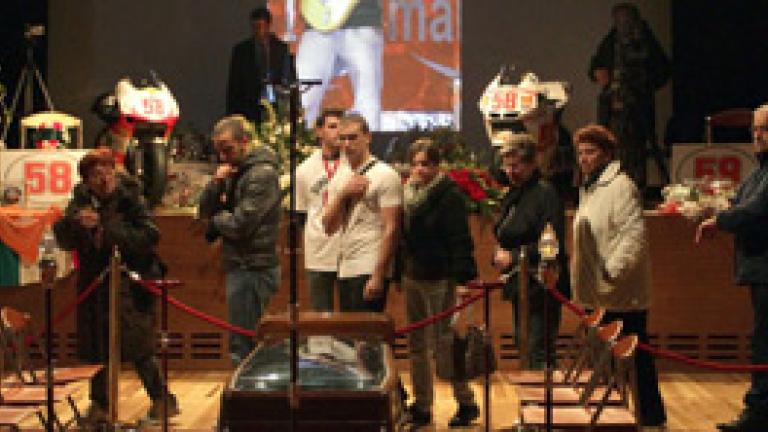 Los habitantes de Coriano, donde residía su familia y donde creció el piloto, y los aficionados han tapizado la fachada del teatro con carteles donde se leen mensajes de adiós y de luto, para "Supersic", como le llamaban cariñosamente.