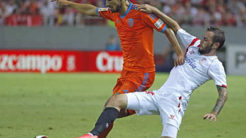 El capitán de los visitantes, Dani Parejo, junto con Rodrigo Moreno y el portugués André Gomes se mostraron superiores en el centro del campo ante un Sevilla en el que la función de creación la tomó el joven refuerzo Denis Suárez, pero no logró conectar casi nunca con el delantero colombiano Carlos Bacca, muy bien marcado. La lógica decía que el gol caería del lado levantino, pero debido a que estaba volcado en buscarlo, llegó una contra sevillista llevada bien por Bacca que culminó Aleix Vidal, no si antes tener que rematar dos veces al responderle en la primera el portero brasileño Diego Alves, hasta entonces inédito.