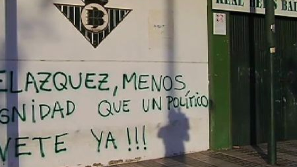 El estadio del Betis se ha levantado hoy con duras pintadas hacía su entrenador, Julio Velázquez, tras la derrota sufrida este domingo ante Osasuna por 3-2. La afición bética pide la dimisión del técnico y, según se ha podido leer en la fachada del campo, se reclama la vuelta del ex entrenador verdiblanco Pepe Mel. En once partidos disputados el Betis ha perdido cuatro.