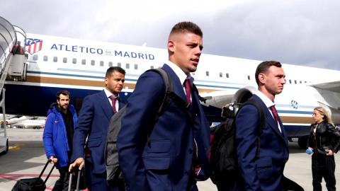 Imágenes del equipo de fútbol Atlético de Madrid que ha viajado este lunes a Turín para disputar este martes su pase a cuartos de final de la Liga de Campeones contra la Juventus.