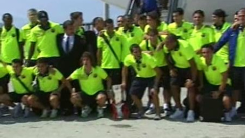 El FC Barcelona suma y sigue. Todo lo que juega lo gana. Anoche conquisto su quinto título del 2009, la Supercopa de Europa ante el Shakhtar Donetsk. La expedición azulgrana ha llegada esta mañana al aeropuerto de El Prat de Barcelona. Los primeros en bajar han sido el capitán, Carles Puyol, y el entrenador, Pep Guardiola. Los jugadores han posado con la copa y han cantado: 'Campeones, campeones".