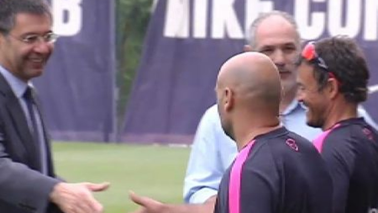 Josep María BArtomeu y Andoni Zubizarreta han visitado en Sant Joan Despí a la plantilla de Luis Enrique. En el entrenamiento ya se han podido ver a los internacionales como Xavi, Piqué, Iniesta, Busquets, Alba, a los que el presidente del club les ha recibido con un amistoso abrazo. También se han visto a las nuevas incorporaciones como Mathieu y Ter Stegen.