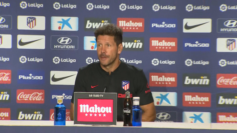 Imágenes de la rueda de prensa del entrenador del Atlético de Madrid, Diego Pablo Simeone, en la rueda de prensa posterior al último entrenamiento antes de enfrentarse al Getafe en la primera jornada de Liga.