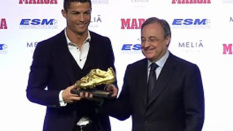 Cristiano Ronaldo ha recibido esta mañana la Bota de Oro que comparte con Luis Suárez por ser el máximo anotador de las ligas europeas. El presidente del Real Madrid le ha entregado el galardón. El portugués no ha dudado en cogerlo y besarlo.