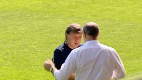 Curiosa reunión la que se ha podido ver esta mañana en el entrenamiento del FC Barcelona en la Ciudad Deportiva Joan Gamper Sant Joan Despí. Sobre el césped ha tenido lugar una pequeña 'cumbre' entre Gerardo 'Tata' Martino y Andoni Zubizarreta. Ha sido una semana complicada tanto para el técnico como para el director deportivo con la eliminación de la Champions League a manos del Atlético de Madrid pero ambos han querido transmitir una imagen de unidad. A la salida de la Ciudad Deportiva 'Tata' Martino se ha parado a fotografiarse con aficionados. Algunos de ellos le han transmitido ánimos de cara a la final de Copa del miércoles annte el Real Madrid.