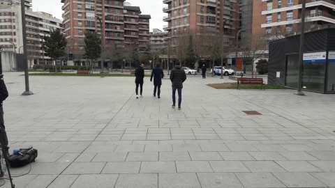 Imágenes de los exjugadores del Betis Xabier Torres y Jordi Figueras que salen del Palacio de Justicia de Pamplona al finalizar una de las sesiones del juicio por el denominado caso Osasuna.