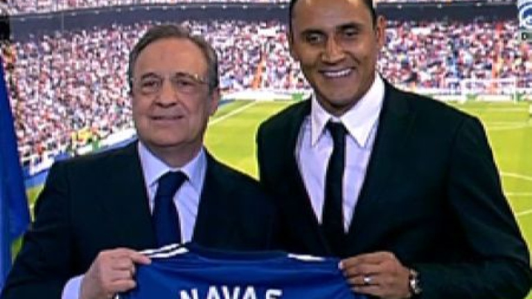 El nuevo portero del Real Madrid, Keylor Navas, ha sido presentado esta mañana en el Estadio Santiago Bernabéu. El costarricense se ha mostrado en todo momento muy sonriente y emocionado cuando le ha tocado posar con la que será su nueva camiseta, en este caso, con el número 13. Navas ha estado acompañado por su mujer y su hija.