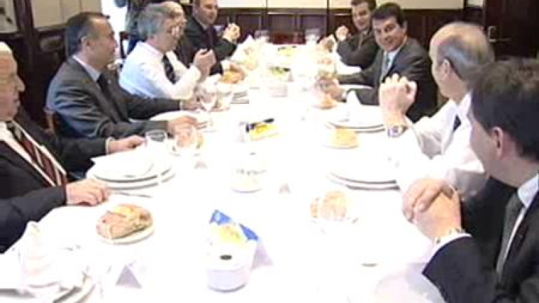Los presidentes del Atlético de Madrid y del Barcelona, Enrique Cerezo y Joan Laporta, comen a estas horas juntos en un conocido restaurante madrileño. Ambos equipos se juegan mucho esta tarde. Si el Barça pierde, aumentaría la presión sobre el club. Laporta cree que esta tarde su equipo 'no se juega la Liga'. Por su parte, el Atlético de Madrid necesita imperiosamente la victoria para no alejarse de los puestos de Liga de Campeones.