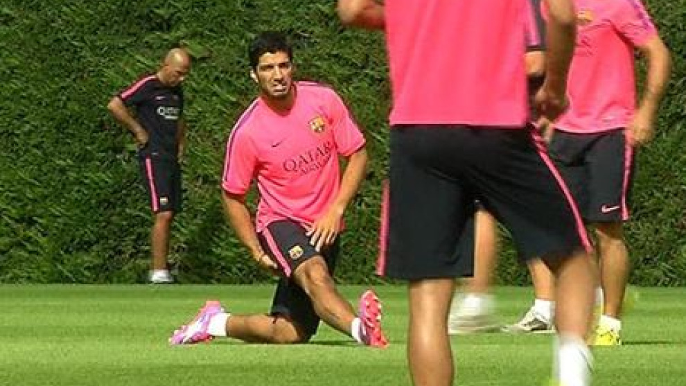 Luis Suárez se lo pasa en grande en el entrenamiento del Barça