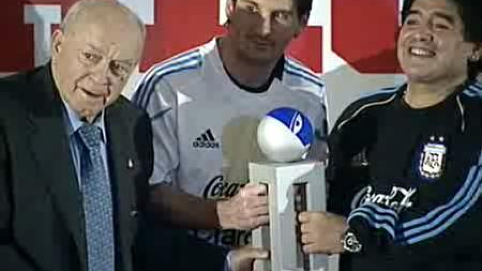 Lionel Messi, delantero del Barcelona, recibe el premio Alfredo Di Stefano, que acredita al futbolista argentino como el mejor jugador del fútbol español en todas las competiciones.Lionel Messi consiguió reunir en una foto a los tres mejores jugadores de la historia del fútbol argentino y mundial. El actual seleccionador argentino, Diego Armando Maradona, el ex jugador del Real Madrid, Alfredo Di Stefano y él, que tal vez el mejor jugador del planeta actualmente. Entre los dos grandes mitos, el delantero blaugrana recibió de sus manos el premio que le acredita como mejor jugador de la Liga.