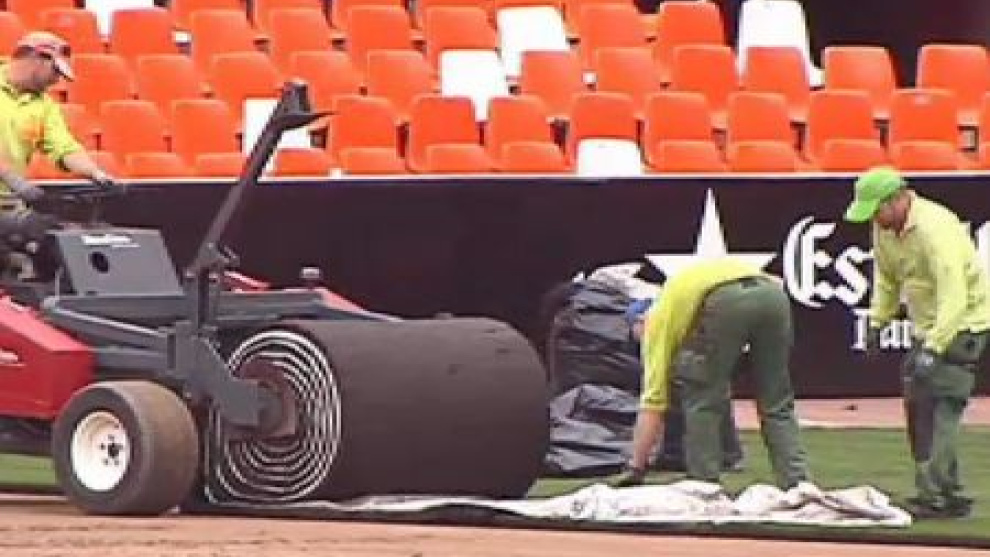 Con algún día de retraso pero ya está listo. El campo del Valencia ya tiene instalado un nuevo césped. Este, que se estrenará la próxima jornada de Liga, en la que el Valencia recibirá al Barcelona, estará ya enraizado y no supondrá ningún problema para los jugadores. El cambio del verde se ha hecho después de las malas condiciones que se evidenciaron tras el encuentro del Athletic de Bilbao.