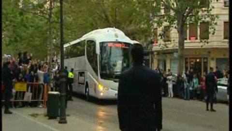 El Real Madrid se siente como en casa en Valencia. Decenas de seguidores del Real Madrid han acudido al hotel Palau de la Mar para dar ánimos a los chicos de Mourinho de cara al partido de este miércoles en la final de la Copa del Rey contra el Barça. Además, cerca de un millar de aficionados blancos han recibido al Madrid en el aeropuerto de Manises.
