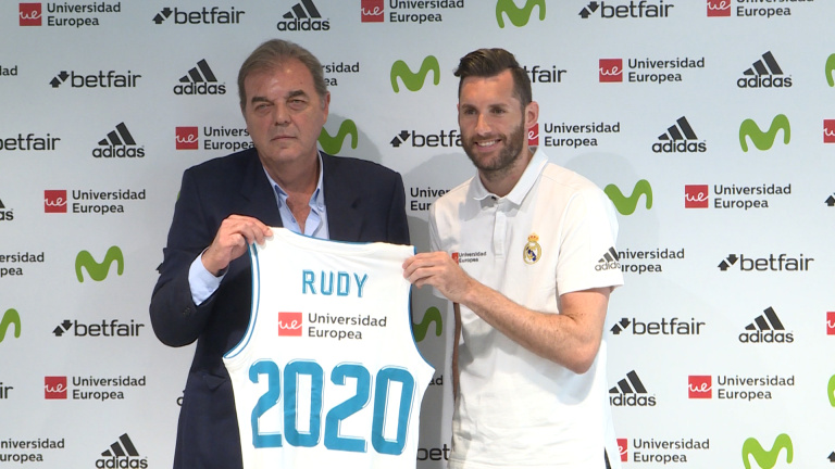 Imágenes del jugador del Real Madrid Rudy Fernández, y del director de la sección de baloncesto en el Real Madrid, Juan Carlos Sánchez, en la rueda de prensa de la renovación del jugador en el club del Real Madrid.