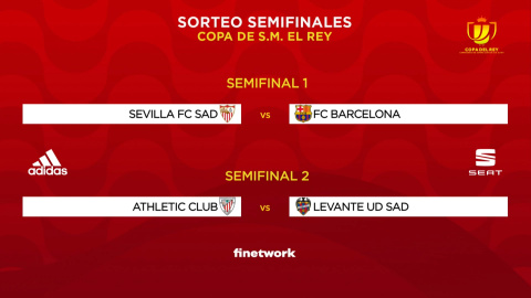 Sevilla FC-FC Barcelona y Athletic Club-Levante UD son los emparejamientos de semifinales de la Copa del Rey, tras el sorteo puro celebrado este viernes en la Ciudad del Fútbol de Las Rozas, en el que el exdelantero rojiblanco Aritz Aduriz ha sido el encargado de dar a conocer los nombres de los equipos.