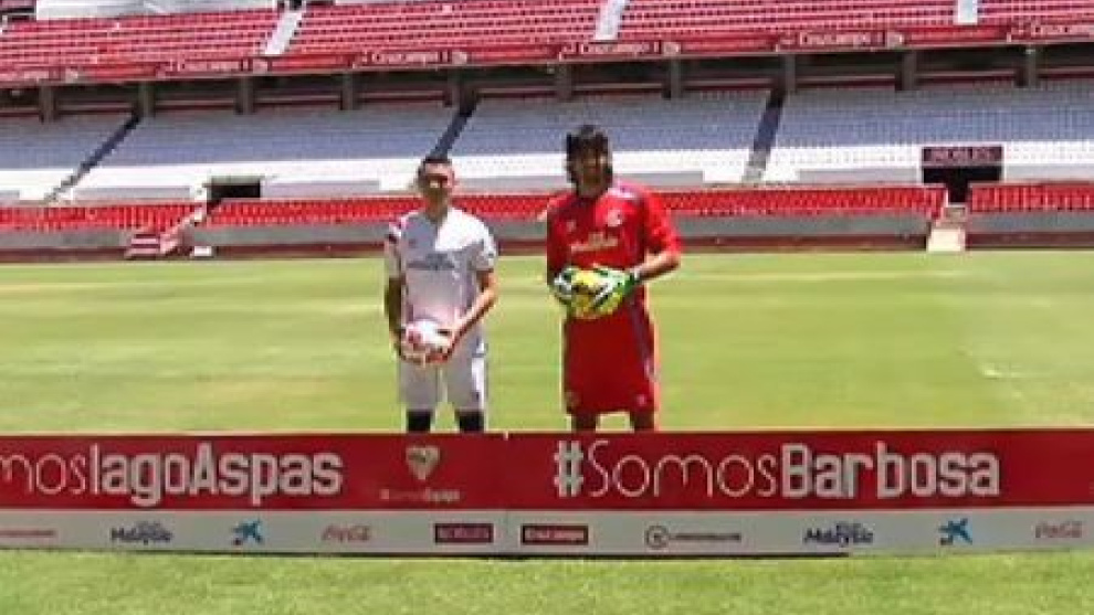 Iago Aspas y Barbosa ya posan con las nuevas camisetas de su nuevo club. El Sevilla ha presentado esta mañana a sus nuevas incorporaciones y posteriormente han entrenado junto al resto de sus compañeros.
